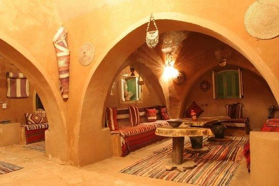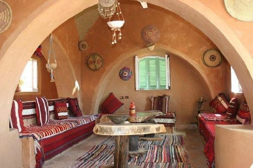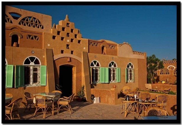 Værelserne er indrettet i traditionel nubisk design med hvælvede lofter og dekorativ udsmykning.